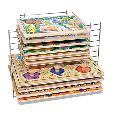 A puzzle rack to solve your storage puzzle! This sturdy wire puzzle rack holds up to 6 large and 6 small puzzles for convenient clean up and organization.