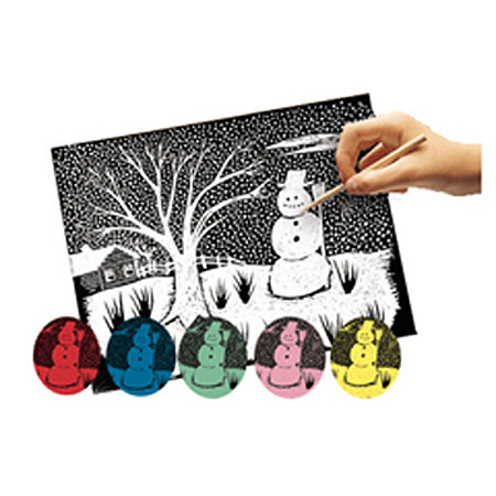 These colored sheets are coated with black ink that can be scratched with a wood stick to reveal spectacular color. Package includes blue, green, pink, red, white, and yellow. Stick included.