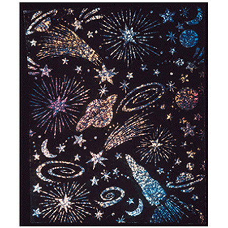 A stunning new effect! Aspiring artists can obtain dramatic results with this Soft-Scratch™ black coated 10 pt. holographic board. Scratch off the black coating with a stick to reveal glittering color beneath the surface. Pictures and designs reflect light and produce sparkling prismatic colors. 8 1/2" x 11".