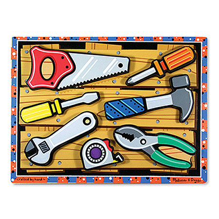 Two screwdrivers, a hammer and a saw are four of the essential seven tools in this collection. This extra thick wooden puzzle includes seven easy-grasp, chunky tool shaped pieces, each with a full-color, matching picture underneath. Tool pieces can stand on edges for pretend play. Encourages eye-hand, fine motor and creative expression skills.