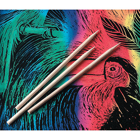 Hardwood sticks for drawing on Scratch-Art® Papers, Soft-Scratch™ Boards, and Scratch-Lite®. Pointed at one end. Economically priced. Bulk packs are great for the classroom. Size 4 1/2 inches long x 3/16 inches diameter. |