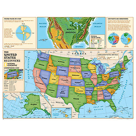 Unlike other classroom poster maps, ours utilize the Winkel-Triple projection, which provides the best combination of size, shape, and distance giving the student the best visual representation of the Earth's surface. This solves the effect seen on other maps where Greenland appears larger than South America. Our new maps start early elementary kids off right. Our Beginner Series, grades K-3, contains an easy to read maps of the World and United States. Scale = 1:30,000,000 |