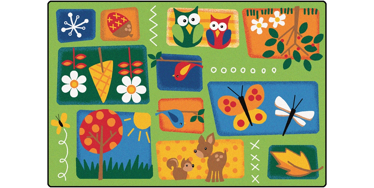Simple and sweet, the cuddly animals on this green nature theme, eco-friendly area rug will bring warmth to any or school classroom or child's room.