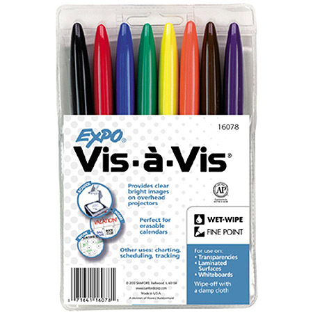 Expo Vis a Vis Overhead Wet Wipe Mkr Fine Asst 8p Delivers even lines Quick drying ink provides excellent clarity and visibility Won't fade or bubble under intense heat