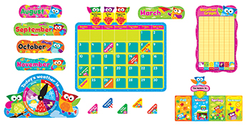 It's a date! Explore and highlight special days, months, seasons, and the weather. Includes a 17 1/2" x 23 1/4" calendar, weather graph, weather wheel, seasons card with slider, 33 numbers, 12 month headers, 44 special days, blank header, and Yesterday, Today, Tomorrow sliders. 100 pieces. Coordinates with Owl-Stars!™ Collection. |