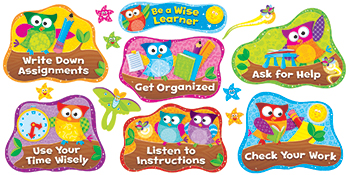 Lively owls offer reminders on how to be a good student. Post signs around the room and the wise messages help kids stay on track. Clever accents make these study habits even more eye-catching! Includes 7 signs, 7 accents. Signs include: Ask for Help, Be a Wise Learner, Check Your Work, Get Organized, Listen to Instructions, Use Your Time Wisely, and Write Down Assignments. Largest piece is 18" W by 13" H. Ideal for teaching: 1st Grade to 4th Grade Ages 6 to 10 |