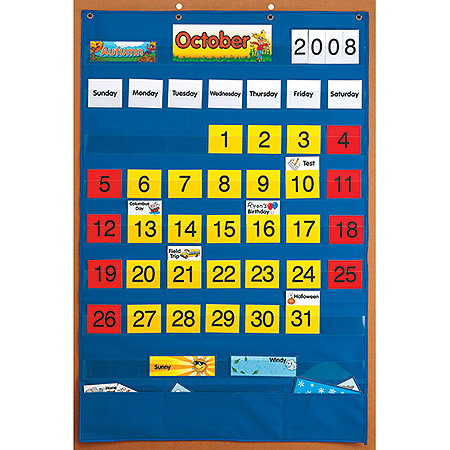 This perpetual wall calendar measures 25 1/2" x 38 1/4" and has 46 see-through pockets. Cards that fit into the pockets include month, date, year, day of the week, weather, seasons, and special events. Birthday and special-event cards can be personalized with a dry-erase marker. For added value, the backs of the cards are in Spanish. Three extra storage pockets at the bottom of the chart make for easy storage and access.