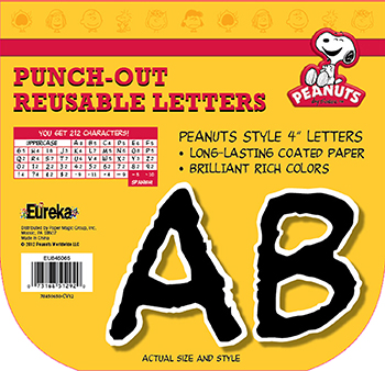 Reusable 4" letters printed on coated paper using the very recognizable Peanuts font. 212 Characters. |