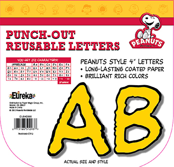 Reusable 4" letters printed on coated paper using the very recognizable Peanuts font. 212 Characters. |