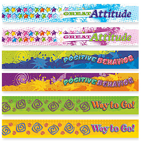 Bright colors, whimsical artwork, and fun phrases catch kids' attention and motivate them to reach goals. Arm Charms are ideal for celebrating a special occasion, rewarding individual or class achievements, encouraging good behavior, or simply brightening up the day! Each package contains 72 paper bracelets measuring 8 1/2'' x 7/8'' (21.6 x 2.2 cm), plus 72 clear adhesive seals to secure the bands around the wrist.