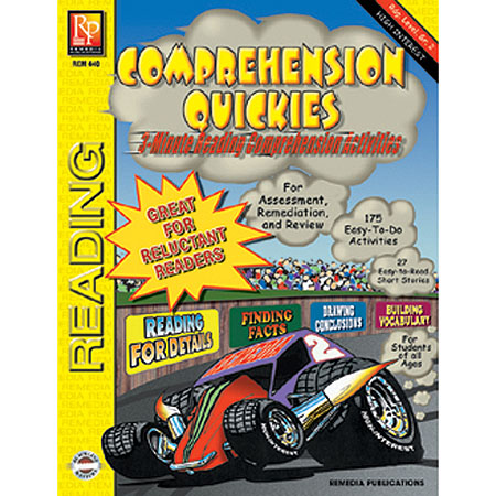Reluctant readers of all ages and those reading below grade level are sure to have fun while they improve their reading skills with Comprehension Quickies! Very short, easy-to-read paragraphs are followed by comprehension activities that require students to pay attention to details, understand the content, know word definitions, draw conclusions, write complete-sentence answers, and more. These quick, non-threatening reading activities are terrific for: students of all ages, students with short attention spans, students who have difficulty reading longer passages, students reading below grade level, anxious and reluctant readers, ESL students, Inclusion, daily enrichment and review |