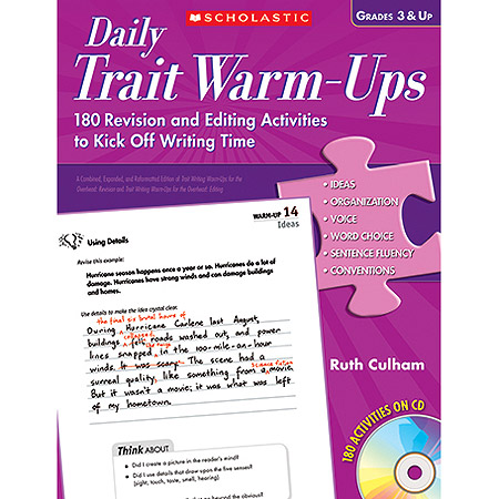By Ruth Culham The most daunting tasks of writing-revision and editing-just became easier and more manageable with the publication of this book. Ruth Culham targets specific skills with short, powerful activities that help students gain independence and confidence as they revise their work for ideas, organization, voice, word choice, and sentence fluency, and edit it for conventions. The book contains 180 reproducible/downloadable activities-one for each day of the school year-on paper and CD. Plus think-abouts, scoring guides, checklists, and more. 208 pages plus CD 8 1/2" x 11" Grades 3 & Up |