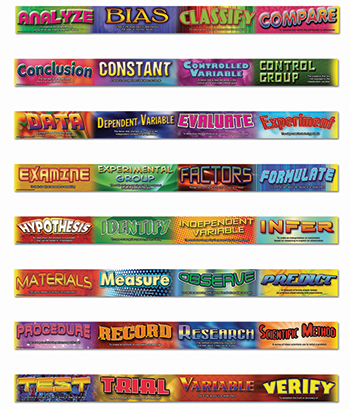 This eight-strip border set features four scientific inquiry vocabulary words with definitions on each strip for a total of 32 words that can be used as a border, cut apart into flash cards, or displayed together on a wall. · (8) 3' x 3" strips for a total length of 24' · Set includes 8 different (non-repeating) strips with 4 vocabulary words per strips · Display as a border or cut apart to use in a math-themed or science-themed bulletin board or as flash cards |