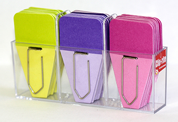 The 2-in-1 instant organizing CLIP-TABS™ help you "clip & tab", write, file and pile in 1 easy step. Clip-Tabs™ hold 1 to 30 sheets together. It's non-smearing, reversible, reusable, removable, recyclable and comes with a lightweight dispenser. |