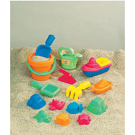This colorful set of plastic sand toys includes everything you need for a fun day at the beach! Assorted sets come with sand molds. rolling truck. bucket. shovels. sieve and more! One style shown.