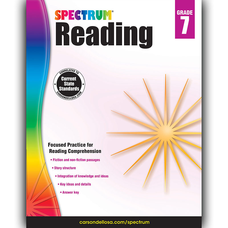 Spectrum Reading for Grade 7 includes focused practice for reading comprehension including fiction and non-fiction passages, story structure, integration of knowledge and ideas, and key ideas and details. Spectrum® Reading workbooks contain focused practice for reading comprehension, including letters and sounds, word recognition, integration of knowledge and ideas, key ideas and details, main idea, story structure, theme, and summarization. Each lesson features an illustrated story followed by exercise in comprehension. A variety of fiction and nonfiction reading passages combined with standards-based learning make these workbooks an essential resource for school success. A complete answer key is included. Spectrum, the best-selling workbook series, is proud to provide quality, educational materials that support your students' learning achievement and success. |