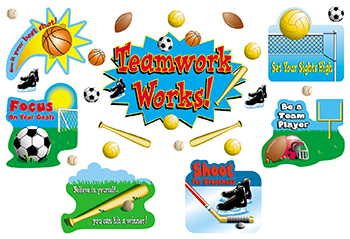 Encourage teamwork among students by investigating six different team sports. All bulletin board pieces are UV coated for extra durability. A 4-page teacher resource guide is included. |