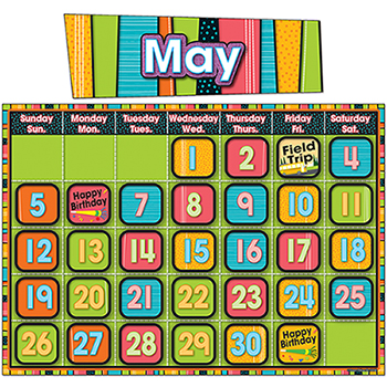 Stylin' Stripes Calendar Bulletin Board Set includes everything you need for a fun, colorful classroom calendar. Set includes calendar, 12 monthly headers and 48 colorful calendar cover-up cards. |