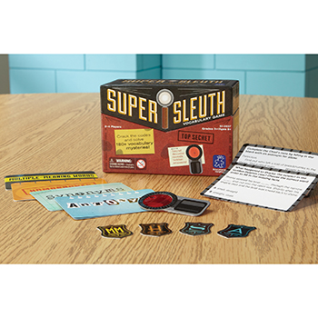 Super Sleuth Vocabulary Game Crack the codes and solve the mysteries! Students take turns answering questions and solving mystery cards to earn badges in each of four categories—synonyms, antonyms, homophones, and multiple-meaning words. Grades 3+/Ages 8+ The nitty-gritty: · Detective-themed vocabulary game · Includes 200 cards in 4 different vocabulary categories, 4 category dividers, 48 die-cut badges, special decoder card, and guide · Teaches synonyms, antonyms, homophones, and multiple-meaning words · Familiarizes students with standardized-test format · For 2 to 4 players |