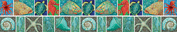 Our NEW Double-Sided Trim is part of our Guest Artist Series and features the work of South Carolina artist Gerri Hyman. Get twice the decorative punch in a single package of trim! One side of the trim has vibrant, colorful designs of seahorses, fish, turtles and octopus. The flip side has designs of shells, seahorses and starfish and jellyfish in beautiful shades of turquoise and sea green with browns and whites. These durable, bright borders are printed on thick, coated paper. Each package contains 12 strips -- a total of 35 feet! Use our Borders to brighten and enhance bulletin boards, frame doorways, define learning centers, and celebrate special events! |