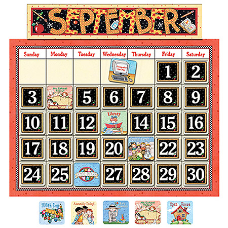 Make every day a special day with this classroom calendar featuring Mary Engelbreit's artwork. This bulletin board includes a blank calendar, easy-to-read numbers pieces, colorful monthly headers, additional pieces for holidays and special occasions, and a 2-page Teacher's Guide. The calendar measures 24" x 18". Includes 68 pieces! All pieces are UV coated for durability.