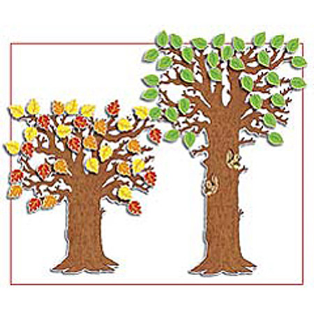 Bulletin Board: Classroom Tree!Plastic-Coated for Color-Fastness and Durability!Large, bare tree that measures 47? wide and is adjustable from 41?to 65? tall! The display comes complete with 32 green leaves and 32 autumn leaves. Use to illustrate seasonal holidays and upcoming events by adding valentines, Easter eggs, patriotic symbols, apples, and much more! Write-on, wipe-off.