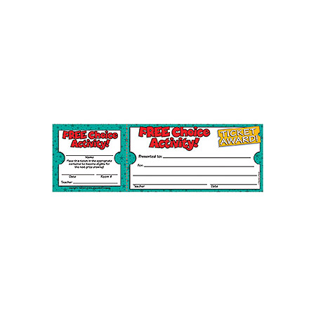 These clever Ticket Awards are padded for easy use. Each award is perforated into two parts. One part is filled out by the teacher and the student takes it home to show parents. The second part is signed by the student and placed in a container for a chance of a prize in a classroom or school-wide drawing! A wonderful way to give positive reinforcement! 100 2-part tickets per pack 8.5" x 2.75" |