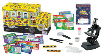Ms. Frizzle and her students take Young Scientists on a wild ride with the Magic School Bus as they explore the world around them with a microscope. Young Scientists learn about the history of the microscope, explore the different parts of a microscope, and discover how to use a microscope. Young Scientists make slides of water droplets, plant parts, textile fibers, all kinds of paper, crystals, and much, much more! This investigative bus-shaped kit comes with a microscope, blank slides, cover slips, tweezers, collecting vial, 20 colorful experiment cards, prepared slides of fungi and algae, and a data notebook to record observations. Seatbelts, everyone! Get ready for to investigate with Microscope Lab! |