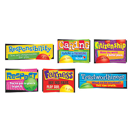 Guide children down the right path to positive character development and reinforce values of trustworthiness, fairness, and respect. Six individual posters display the six traits of good character as used in the Character Counts program. Six pieces, up 26" wide.