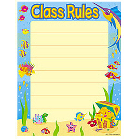 Under-the-sea theme chart with space to post classroom rules. Back of chart features reproducible activities, subject information, and helpful tips. 17" x 22" classroom size.