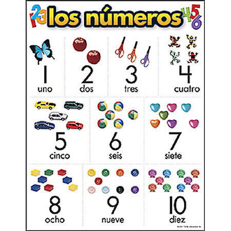 Numerals and Spanish number words are illustrated with colorful photographs of objects to count. Back of chart features reproducible activities, subject information, and helpful tips. 17" x 22" classroom size.