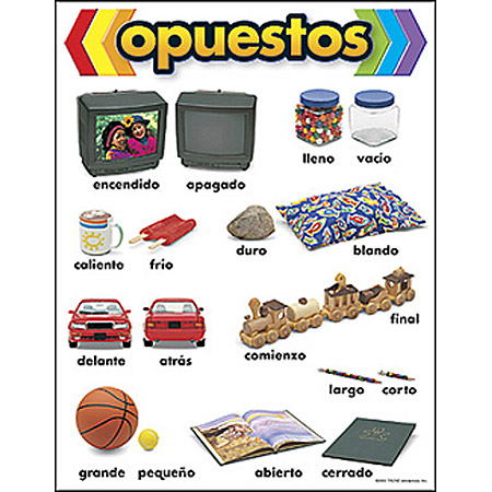Photographs of common objects depict the concept of opposites. Text is in Spanish. Back of chart features reproducible activities, subject information, and helpful tips. 17" x 22" classroom size.
