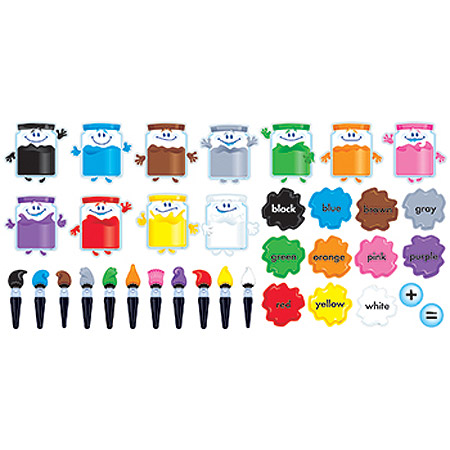 Jaunty Jars and brushes stand ready to help teach 11 colors and color words: red, yellow, blue, orange, green, purple, black, white, brown, gray, and pink. Plus and equal signs for teaching secondary colors. 7 3/4" x 8" jars. 37 pieces.