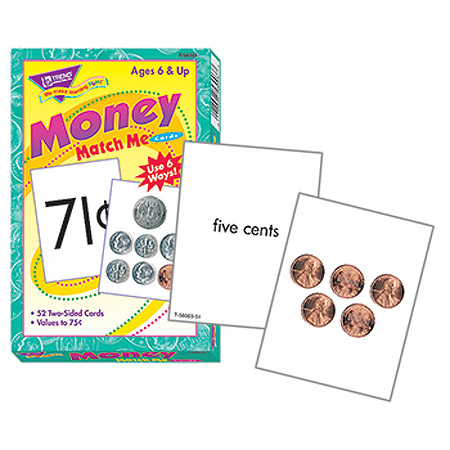 Award-winning Match Me® Cards engage learners' matching, memory, and word/picture recognition skills. Two-sided cards feature photos of coins — pennies to half-dollars — in sets with values to $.75. Totals in numbers and words. Set includes six fun and easy-to-follow activities. Ages 6 & up. 52 cards, 3" x 3 7/8".