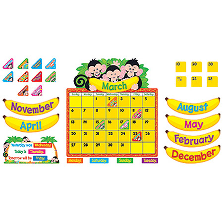 Mischievous monkeys make it fun to teach months, days, weeks, time concepts, weather, holidays, cultural events, celebrations, counting, addition, subtraction, graphing, planning, spelling, reading, and more! Includes: 23¼" x 17 1/2"calendar with separate calendar topper, 12 banana month labels, 33 date markers, 45 holiday and special day markers, 7 day labels, and a yesterday/today/tomorrow sign. 100 pieces.