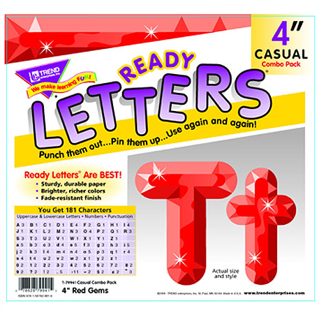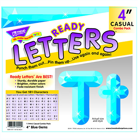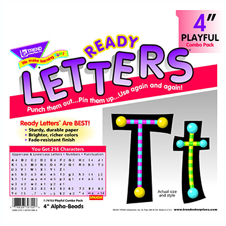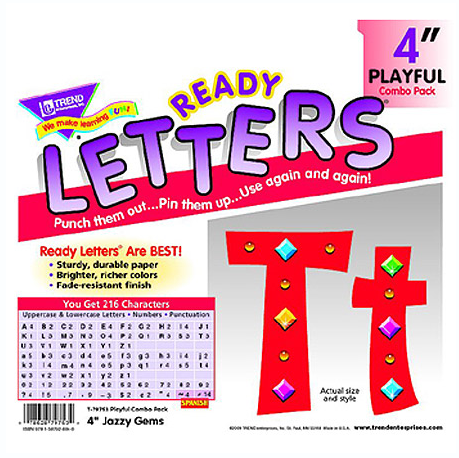 Description Punch out and pin up Ready Letters for attention-getting messages. Set contains: 59 uppercase letters, 83 lowercase letters, 20 numerals 0 , 36 punctuation marks, and 18 Spanish accent marks. Color Options: