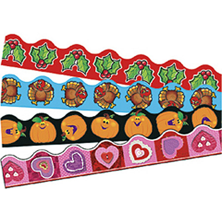 Frame displays and enhance bulletin board themes and lesson plans with vivid designs that brighten any environment. Versatile, value-priced Terrific Trimmers® Variety Packs coordinate with TREND bulletin board sets. 156 feet of trimmer. Includes Pumpkin Pals, Turkey Time, Holiday Holly, and Scrapbook Hearts.