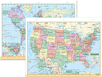 This laminated, educational map has the world on one side and the US on the other. The world map has an inset map of Europe, and the US map has insets of Alaska, Hawaii, and Puerto Rico with the Virgin Islands. This notebook sized map has been three-hole-punched and has a ten-inch ruler on one side and a 25 centimeter ruler on the other. Time zones have been included. This product is ideal for public, private, parochial, and home schools. |