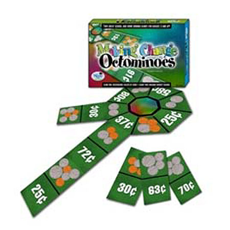 Making Change Octominoes provides playful practice in counting money and making change! It also builds fluency in addition and subtraction. In Coin Values, players match the stated number of cents with a set of coins. In Making Change, players figure the correct change for a dollar and find a matching set of coins. Amazingly, both games are self-checking! The unique octagonal starting board offers eight positions for placing dominoes, intensifying learning. Additional games provide options for meeting specific needs. Includes lesson ideas. For 1-4 players.